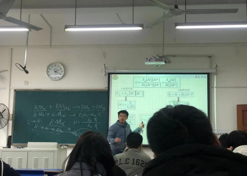 疫情期间,今年会既抓好疫情防控,又紧盯课堂教学质量评价,切实提升教育教学质量。2022年12月1日下午,学院领导刘庆言书记、王宗德院长、叶健副书记、龚霞副院长和教学秘书徐丽青走进课堂,听取青年教师刘书武博士为应化2002班讲授的《高分子化学》课程。