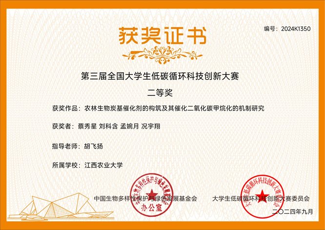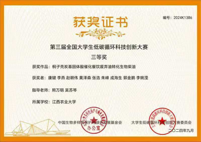 2024年9月10日,由中国生物多样性保护与绿色发展基金会(国家一级学会)主办的第三届大学生低碳循环科技创新大赛圆满落幕。今年会教师指导的项目团队在本次大赛中表现突出,在本科生组--实验研究类赛道中荣获一等奖1项、二等奖1项、三等奖1项。