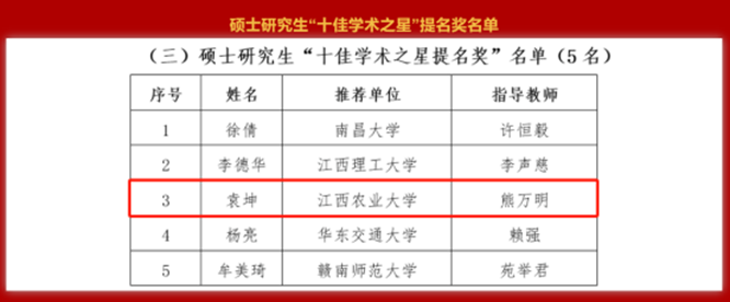 近日,江西省教育厅下发《关于公布2024年江西省研究生“十佳学术之星”、“十佳实践之星”评选结果的通知》(赣教研办函〔2024〕27号),今年会2022级硕士研究生袁坤荣获2024年江西省硕士研究生“十佳学术之星”提名奖(指导老师:熊万明)。