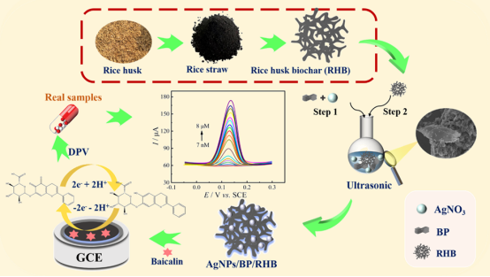 黄芩苷作为传统中药黄芩的标志性黄酮类成分,其精准定量对中药制剂的抗炎、抗氧化药效评价至关重要。然而,传统检测方法如高效液相色谱(HPLC)存在样品前处理繁琐、仪器成本高昂等局限,难以满足现场快速检测需求。黑磷烯(BP)因独特的二维层状结构和高载流子迁移率,成为电化学传感的理想材料,但其在空气中易被氧化降解的缺陷长期制约实际应用。该研究提出“双功能界面调控”理念:利用AgNPs的量子限域效应占据BP表面氧化活性位点,同时通过稻壳生物炭(RHB)的多孔碳骨架增强 π-π 电子共轭传输,二者协同将 BP 的环境稳定性提升至 16 天以上。该复合材料(RHB-BP-AgNPs)修饰的玻碳电极对黄芩苷的检测限低至 5.45 nM(S/N=3),线性响应范围覆盖 0.007-8.0 μm。在清开灵颗粒等实际药样检测中,加标回收率达 95.4-104.6%,相对标准偏≤2.13%,验证了其在复杂中药基质中的适用性。