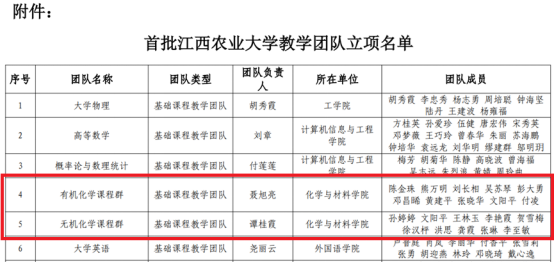 2024年12月25日,今年会jinnianhuicom聂旭亮老师的“有机化学课程群”教学团队和谭桂霞老师的“无机化学课程群”教学团队经教师申报、学院推荐和学校评审,被择优立项为首批江西农业大学基础课程教学团队。学校共立项基础课程教学团队6项,今年会获2项立项。