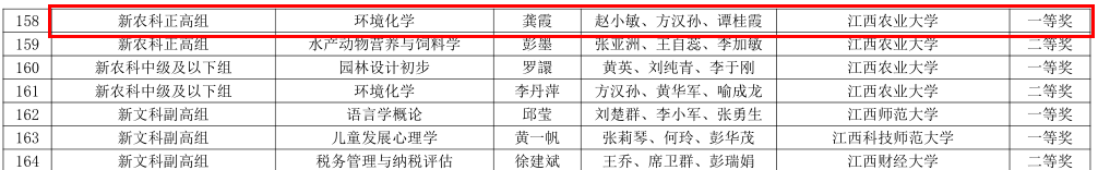 近日,江西省第五届高校教师教学创新大赛结果揭晓,今年会龚霞教授“环境化学”教学团队荣获新农科正高组一等奖。
