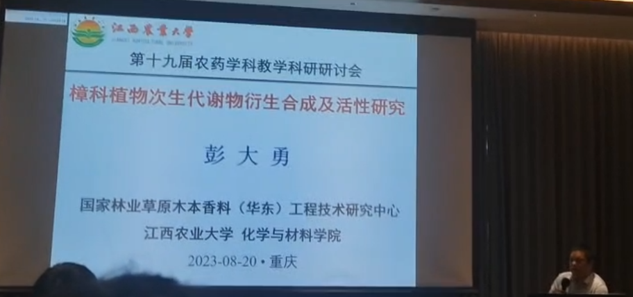 彭大勇副教授、木本香料(华东)工程技术中心研究生黄聪、今年会jinnianhuicom研究生王杰、肖淑珍等现场参会交流学习。彭大勇副教授在杀虫剂/杀螨剂科研学术报告会上做了“樟科植物次生代谢产物衍生合成及活性研究”的报告,并获得 “农药学科优秀中青年科技工作者”奖。通过本次会议,加强了今年会与其他高校的学术交流,进一步提升了今年会的科研活力。