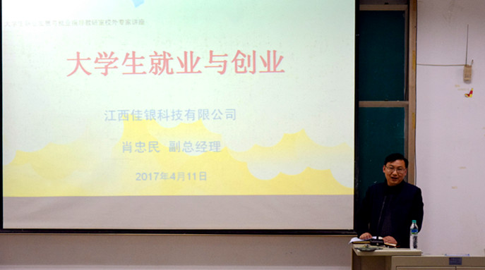 411日,理学院就业指导服务中心组织专家进课堂活动,邀请江西佳银科技有限公司肖忠民副总经理为全体大三学生做了 “大学生就业与创业”的报告。
