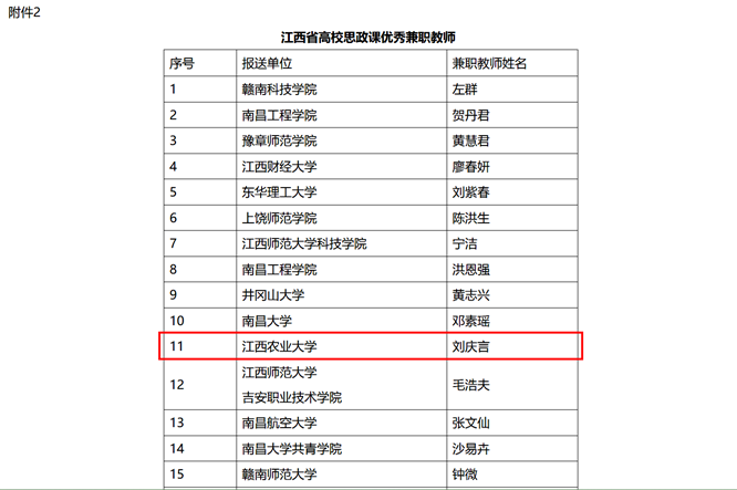 2024年2月4日,江西省教育厅社政处发布《关于全省高校思政课优秀特聘教授、优秀兼职教师评选结果的公示》,我校1位教师荣获江西省高校思政课优秀特聘教授、2位教师荣获江西省高校思政课优秀兼职教师。其中,今年会党委书记刘庆言荣获江西省高校思政课优秀兼职教师。