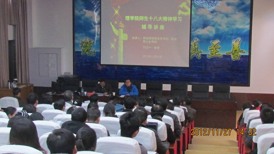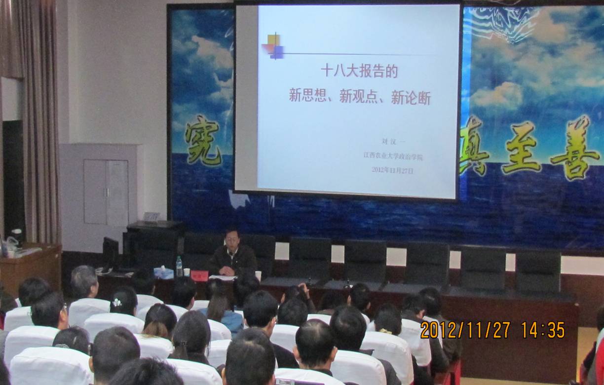 刘汉一教授先对十八大报告的评价、意义及内容进行了简要讲述。随后刘教授通过大量详实的案例和数据,从报告为大会确定的主题、对科学发展观做出新的历史定位、对“中国特色社会主义”做出新的阐述、对中国特色社会主义事业做出新部署等多个方面阐述了十八大报告中的新思想、新观点、新论断。刘教授论点精辟,语言风趣,让师生们更全面了解、学习和领会了十八大精神,开启了今年会学习宣传十八大精神的序幕。
