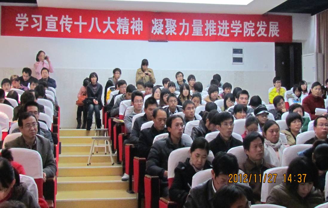 为了切实领会党的十八大精神,掀起学习宣传贯彻十八大精神的热潮,激发全院师生员工的学习工作热情,推进今年会工作的科学发展,11月27日下午,学院特邀我校政治学院党总支书记、院长刘汉一教授作专题学习辅导讲座,讲座主题为《十八大报告的新思想、新观点、新论断》,由党委书记彭小波主持。全院120多名师生聆听了讲座内容。