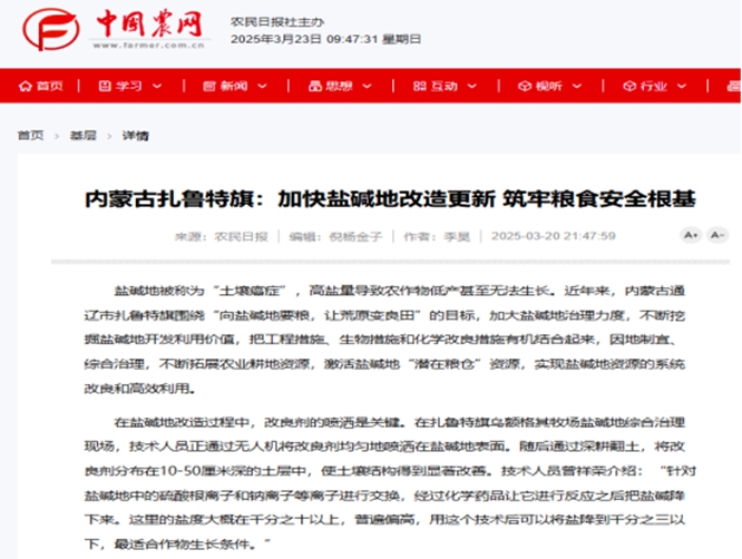 扎鲁特旗农投集团董事长付天生表示,项目采用高校研发的专用改良剂700吨,结合深翻冲碱等技术,预计4月25日完成治理,5月10日前播种,保苗率达90%以上。文阳平教授团队全程提供技术指导,构建“政府主导+高校支撑+企业实施”的创新模式,为盐碱地治理提供可复制经验。