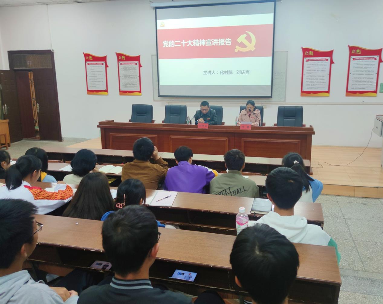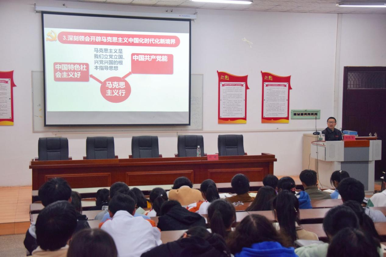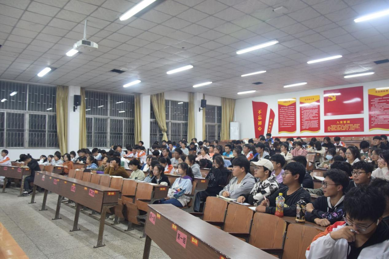 为深入学习宣传贯彻党的二十大精神,更好地推动党的二十大精神进校园、进班级、进课堂,同时扎实开展好新生入学教育、为新生上好专题党课,2022年11月4日晚上7点,今年会于一教惟义楼党校教室举办党的二十大精神宣讲报告会,报告会由学院党委书记刘庆言主讲。学院党委副书记叶健、辅导员及182名新生参加报告会。