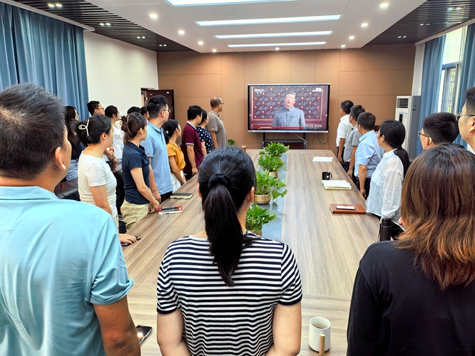 在场人员全程观看中共中央总书记、国家主席、中央军委主席习近平发表重要讲话及检阅部队仪式,见证约70分钟的阅兵盛况。收看期间,大家全神贯注,被威武雄壮的阅兵场面深深震撼。
