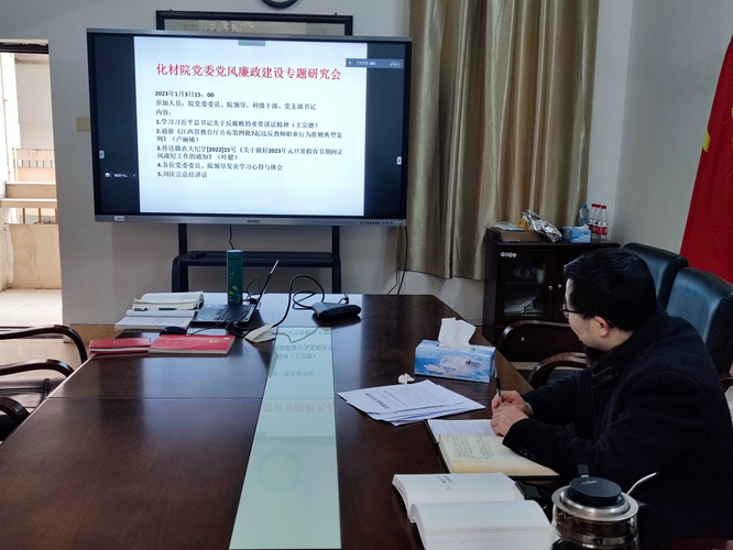 刘庆言作总结讲话。强调2023年伊始,学院就及时召开党风廉政建设及师德师风建设工作专题研究会,意义重大,表明今年会党委高度重视党风廉政建设及师德师风建设,表明今年会党委全面从严治党的决心与态度,为今年全面贯彻落实党的二十大精神开好了头、起好了步,为全年推进工作目标打下了坚实的思想政治基础。对今年会2023年党风廉政建设及师德师风建设工作,他提出三点意见:一是要提高政治站位,坚决执行中央八项规定及《中国共产党廉洁自律准则》等党内规章制度,强化《中国共产党章程》学习;二是各级领导干部要带头示范执行好八项规定及优良的师德师风,为师生做好表率;三是各级领导干部要积极营造风清气正、干事创业的良好氛围,创造风清气正、干事创业的良好条件,打好风清气正、干事创业的良好基础,奋力推进化材院高质量发展。