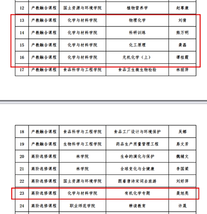 202414,学校公布了2023年度33门校级课程立项结果,今年会立项5项。刘倩老师的“物理化学”课程、熊万明老师的“科研训练”课程、龚磊老师的“化工原理”课程、谭桂霞老师的“无机化学(上)课程”获批产教融合课程立项。聂旭亮老师的“有机化学专题”课程获批高阶选修课程立项。