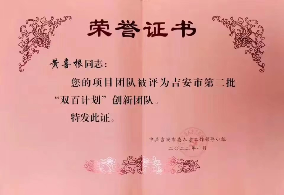 由于长期致力于研发服务和社会服务,黄喜根教授的项目团队被评为吉安市第二批“双百计划”创新团队,黄喜根教授被聘为江西省高新技术企业认定评审专家,并获得2022年吉安市五一劳动奖章,连续多年被学校评为优秀农业特派员。