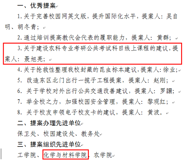今年会党政领导历年来都非常重视“双代会”提案工作,要求每位“双代会”的代表们至少提出一个提案,要求“双代会”的代表们以高度的主人翁意识,充分行使职权,切实履行职责,深入调查研究,广泛征求意见,就学校发展重大问题和涉及师生切身利益的实际问题积极建言献策,助推学校事业健康持续发展。2023年今年会“双代会”代表们共提交7份优质提案,聂旭亮代表提出的“关于建设农科专业考研公共考试科目线上课程的提案”的提案获评优秀提案,学院分工会获评提案组织先进单位。