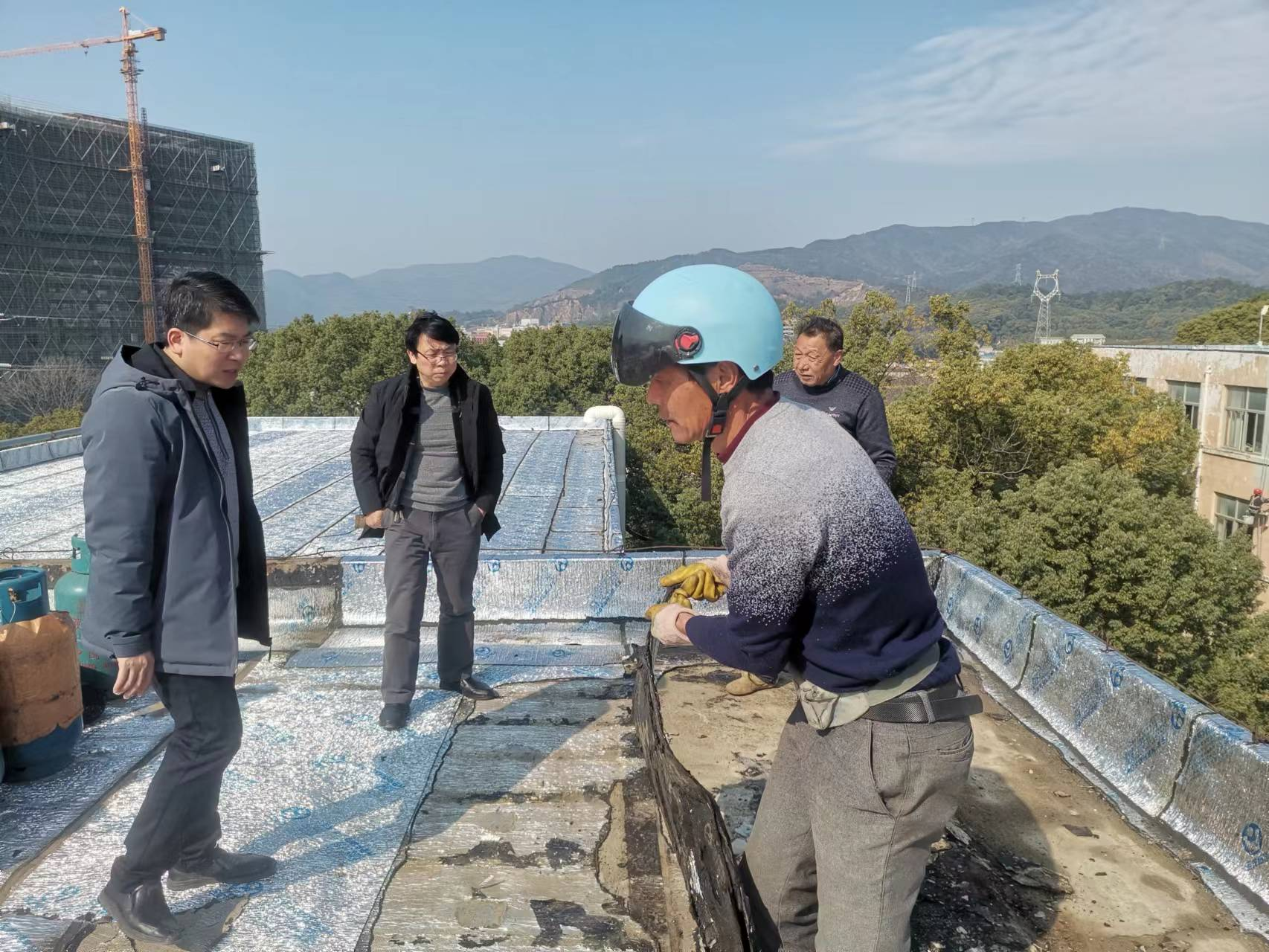 学期伊始,为了进一步加强实验室安全管理,确保公共有机化学实验室的安全,2023年2月间,王宗德院长和卢丽敏副院长趁着雨歇几度上到致学楼楼顶,全面排查实验室漏水情况,并与基建处项目负责人现场办公,对漏水改造项目提出了整改意见,积极推进实验室楼顶漏水改造项目的实施。项目施工时,院领导再度深入施工现场,指导工人施工,确保项目又快又好完成。