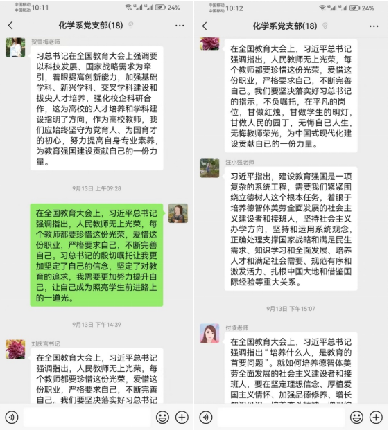 “要实施教育家精神铸魂强师行动,加强师德师风建设,提高教师培养培训质量,培养造就新时代高水平教师队伍。”2024年9月13日,化学系党支部以“学习贯彻全国教育大会精神”为主题开展主题党日活动,传达学习习近平总书记在全国教育大会上的重要讲话精神和全国教育大会精神。各党员同志认真学习贯彻文件要求,同时在微信热烈交流讨论,分享自己的学习体会。通过本次党日活动,大家纷纷表示要时刻牢记习近平总书记的嘱托,全面贯彻党的教育方针。