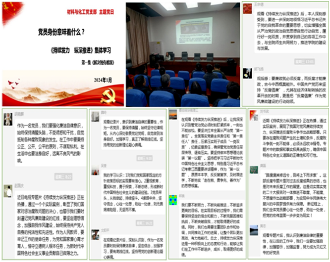 202411113日,材料与化工支部持续开展了《政治监督保障》、《强化正风肃纪》、《一体推进三不腐》的线上自学活动,党员们积极观看,并在微信群发表了自己的观后感。通过这次“线上线下混合式”的主题党日活动,材料与化工支部的党员们坚定了廉洁自律、纵深推进反腐败争的意识,明确了党员身份的重担,期待以此推进工作高质量发展、取得新进展新成效。