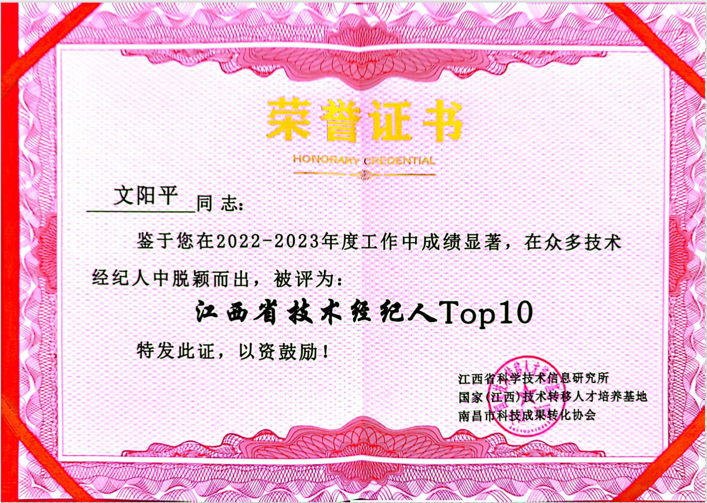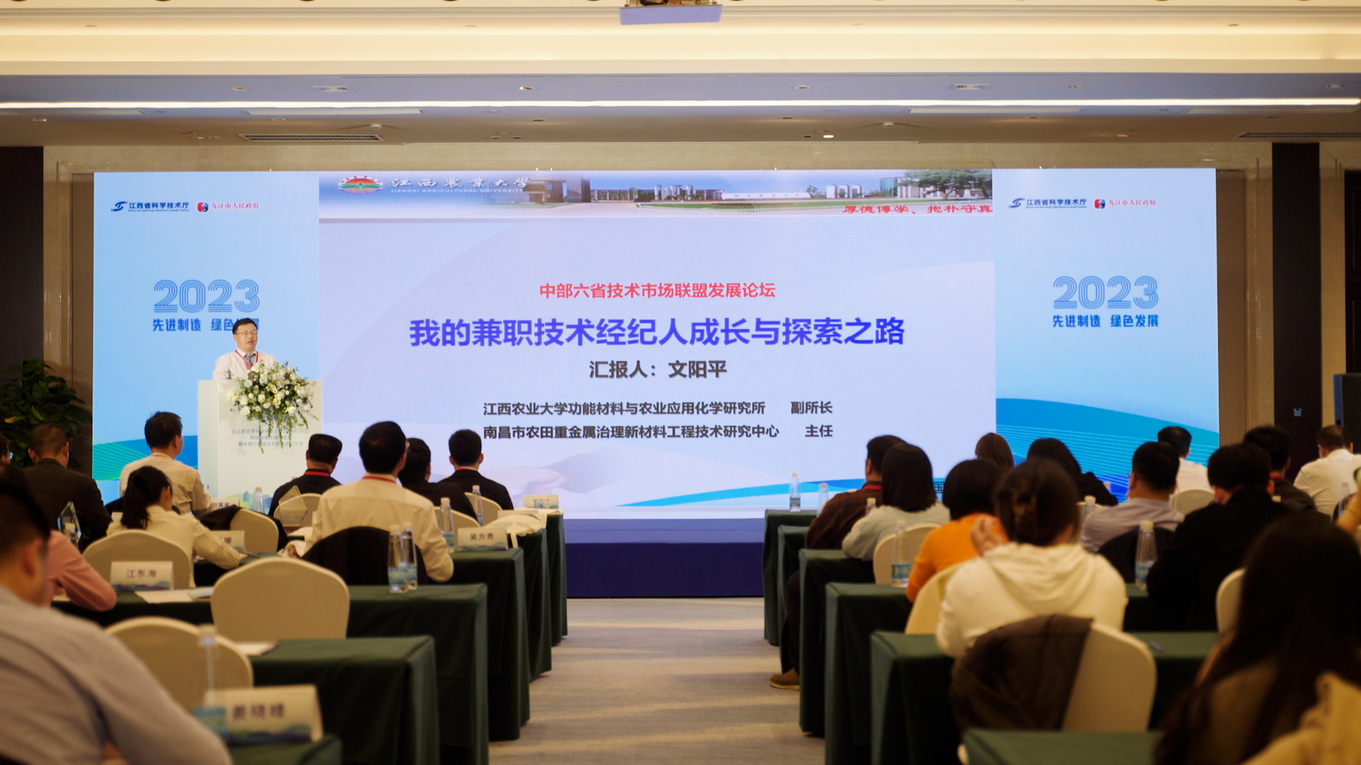 中部六省技术市场联盟发展论坛上,2023年度江西省技术经理人TOP10榜单发布并颁奖,其中我校青年教授文阳平博士荣获江西省技术经理人TOP10榜首。会上文阳平分享了他兼职技术经纪人成长与探索之路,通过典型案例分析如何做兼职技术经纪人及其成效,同时从成果需求方、供给方和技术经纪人服务方三个角度指出技术经纪人服务科技成果转移转化存在问题和解决办法,最后提出了“政产研服”四位一体技术经纪人新模式。