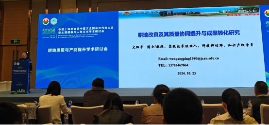 今年会文阳平教授,围绕《耕地改良及其质量协同提升与成果转化研究》为题,为与会者分享了一场精彩纷呈、见解独到的报告。报告中,不仅详尽阐述了其研究团队如何巧妙运用工农业及林业废弃物这一丰富而往往被忽视的资源,开展创新性的耕地改良与质量提升工作,还深入探讨了这些举措对于促进土壤生态平衡、提高农作物产量与品质的积极作用。同时在报告中特别强调科研成果与社会需求紧密结合的重要性,并分享了团队在探索将科研成果有效转化为实际应用路径上的宝贵经验,为全国范围内致力于科技成果转化的科研工作者搭建沟通的桥梁,共同探讨如何在国家政策引导和社会需求驱动下,更高效地将实验室里的研究成果转化为推动农业可持续发展的强大动力。会议结束后,文阳平教授的报告赢得了广泛赞誉。多位来自不同领域的专家对其在耕地改良领域的独到见解、对废弃物资源化利用的创新实践,以及在促进科研成果转化方面的积极探索表示了高度的认可与赞同。他们一致认为,文教授的工作不仅为解决当前耕地质量下降、资源循环利用等紧迫问题提供了新思路,也为我国农业科技发展树立了典范,激励着更多科研工作者投身于这一富有挑战与机遇的领域,共同为实现农业绿色转型贡献力量。