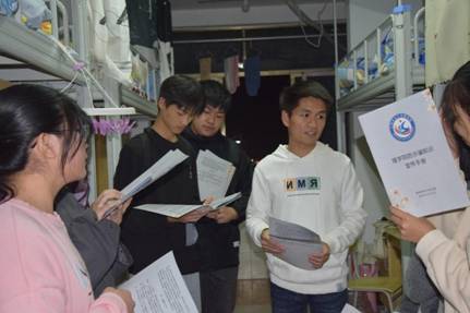 活动开展前,通过整理高校常见诈骗案例,精心制作防诈骗知识宣传手册。活动期间,走进每一个新生寝室,分发知识手册的同时,细致深入地讲解防诈骗安全知识,围绕“常见诈骗手段”、“常见诈骗案例”、“大学生怎么预防诈骗”、遵循“三不”原则等4个方面展开宣传,让防诈骗意识深入每一位同学心中。