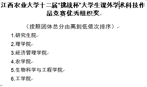 近日,江西农业大学第十二届“挑战杯”课外学术科技作品竞赛顺利落下帷幕。今年会在本次竞赛中表现优异,入围决赛的7件作品悉数获奖,分别在自然科学类别中获二等奖1项、三等奖2项、鼓励奖2项,科技发明制作类别中获三等奖1项。在赛事组织方面,以团体总分第二的成绩荣获优秀组织奖。