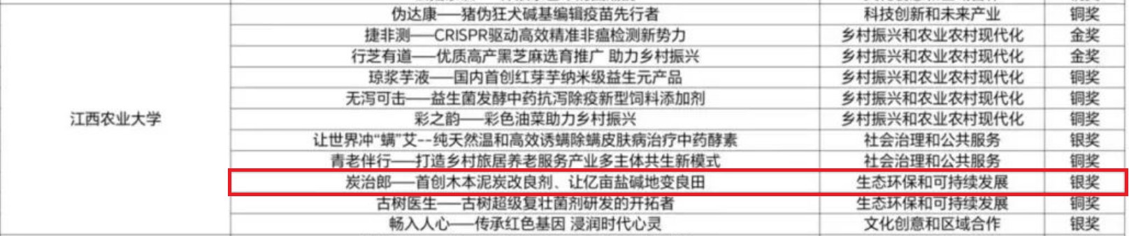 5月23日,由共青团江西省委、江西省教育厅、江西省人社厅、江西省科协、江西省学联办共同主办的第十四届“挑战杯”江西省大学生创业计划竞赛圆满落幕。今年会《炭治郎-首创木本泥炭改良剂、让亿亩盐碱地变良田》项目紧密结合市场需求,提出了切实可行的商业模式和运营策略,得到了评委们的高度认可,在众多参赛队伍中脱颖而出,获得省赛银奖。