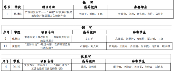 其中,由文阳平老师指导,曾祥荣、刘欣、高先蓉等5位学生参与的项目《竹缠绕复合管——“双碳”时代乡村振兴的绿色环保管道万亿级新产业》获得银奖;由文阳平老师指导,高泽骏等5位同学参与的项目《木本泥炭土壤改良剂——盐碱地变绿洲 的先锋卫士》获得铜奖;由卢丽敏老师、刘光斌老师共同指导,黄海燕、王佳卉、肖金丽、肖青燕、鲍承祺等6位同学共同参与的项目《“蓝海市场”-敏捷传感,农药残留监测技术与服务》获得铜奖;由龚霞老师指导,谢书怡、李清青、孙文雯等5位同学参与的项目《变废为宝,碧水净土——“酸浸-水洗” 工艺去除磷石膏的磷氟污染》获得优胜奖。