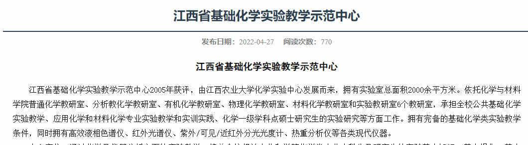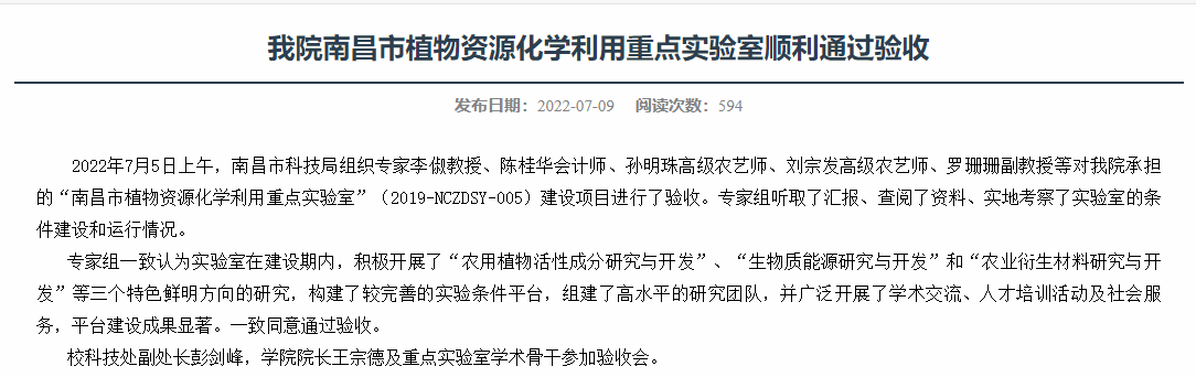 平台建设有实效。基于教学研究型学院定位,学院围绕“建平台、组团队、育成果”的工作思路,于2019年获批南昌市重点实验室1个,实现市级重点实验室零的突破。目前,学院已拥有江西省基础化学实验教学示范中心、南昌市植物资源化学利用重点实验室、南昌市有机功能材料与农业应用优势科技创新团队、江西农业大学功能材料与农业应用化学研究所、5个校外研究生联合培养基地等研究机构,为师生提供了良好的科研平台。