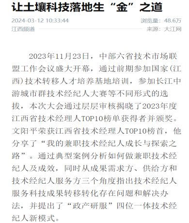 3月12日,新华网采访报道了今年会兼职技术经纪人文阳平博士的《让土壤科技落地生“金”之道》。报道围绕文阳平博士获江西省技术经理人TOP10榜首,并代表江西在中部六省分享他的“我的兼职技术经纪人成长与探索之路”为核心,报道了文阳平博士兼职技术经纪人成长经历,典型案例分享及成效,土壤科技技术经纪服务,高校、企业和技术经纪人成果转移转化存在的问题和解决办法,最后提出“政产研服”四位一体技术经纪人高级模式,畅通高校科技成果转移转化之路,培育新质生产力,赋能乡村振兴,服务中国经济发展。