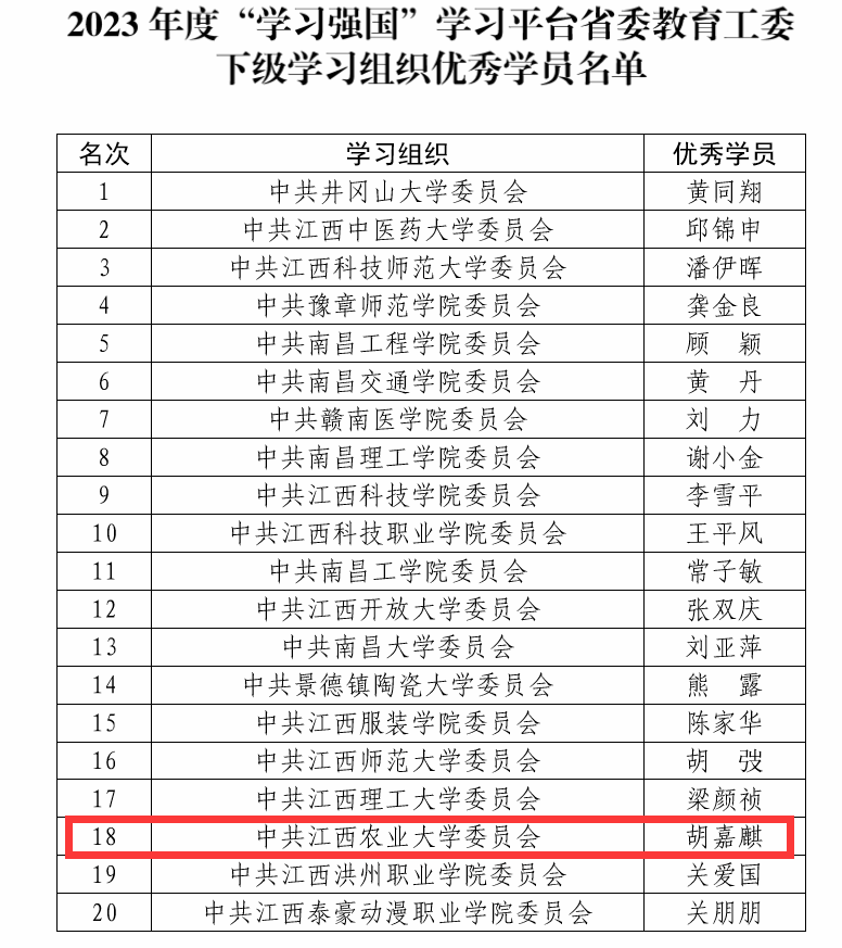 日前,中共江西省委教育工委发文公布了2023年度“学习强国”学习平台省委教育工委下级优秀学员、优秀供稿单位和优秀供稿员评选结果,今年会材料与化工系教工党支部党员胡嘉麒作为学校唯一代表获评2023年度“学习强国”学习平台省委教育工委下级学习组织优秀学员。