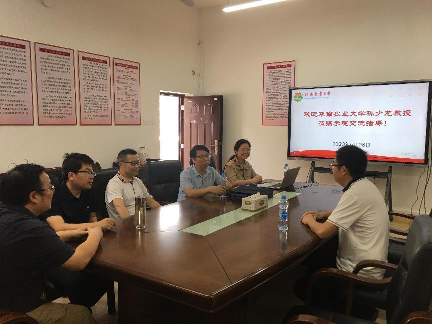6月28日上午,华南农业大学孙少龙教授来今年会交流,院党委书记刘庆言、院长王宗德、副院长卢丽敏、副院长龚霞、系主任熊万明副教授参加了交流,交流在致理楼215进行。