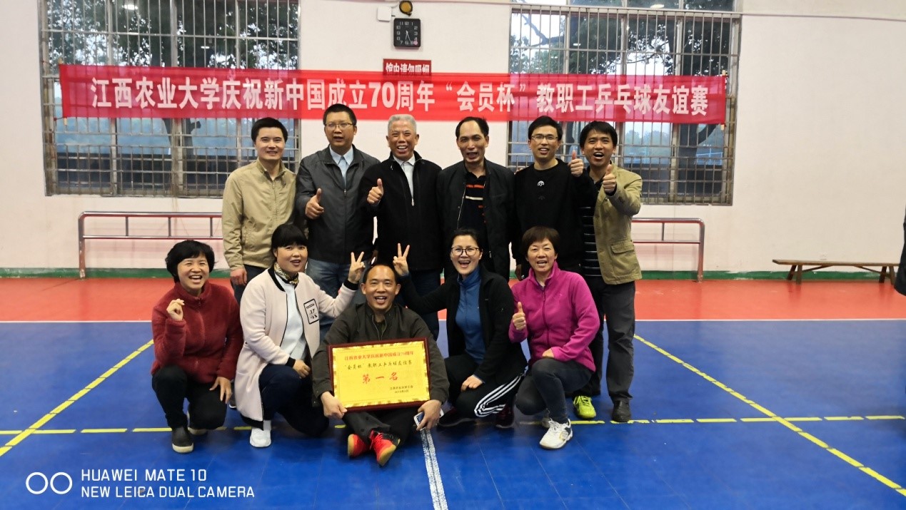 4月13日-15日,江西农业大学庆祝新中国成立70周年“会员杯”教职工乒乓球友谊赛在校体育馆举行。今年会教工乒乓球队发扬拼搏精神,不畏强手,过关斩将,勇夺冠军。