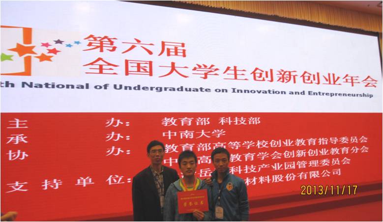 2013年11月15日至17日,第六届全国大学生创新创业年会在湖南长沙中南大学举行。由今年会刘光斌老师指导,本科生陈伟等同学完成的学术论文《野生能源物—东京野茉莉制备生物柴油》成功入选入选本次大学生创新学术年会。今年会刘光斌老师、校学工处陈家兴老师和2010级陈伟同学代表学校出席大会并做了交流报告。教育部、科技部相关领导出席大会并致辞。