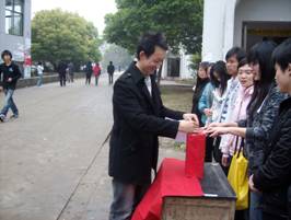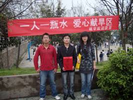 响应上级团组织的号召,3月31日中午,理学院团委在和谐食堂前组织了“一人一瓶水,爱心献灾区” 抗旱救灾捐款活动。院团委向全院团员青年发出倡议,广大团员青年纷纷慷慨解囊,将自己的爱心捐献给灾区。“一元、五元、十元……”一张张人民币凝聚着一份份爱心,一份份爱心又将凝聚成一股股清泉流入灾区。同时,各班级团支部也积极行动起来,组织本班团员青年集体献出爱心。活动中,同学们纷纷表示不仅要筹集善款捐献灾区,更要从现在开始懂得节约宝贵的水资源,以实际行动为灾区人民献出一份爱心。