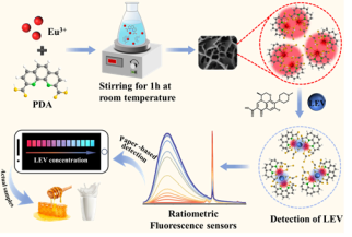 本工作设计了一种基于荧光铕金属有机骨架(Eu-MOF)的目标自校准比例荧光传感平台用于左氧氟沙星(LEV)的灵敏视觉检测。室温下条件下,将Eu3+与1,10-菲罗啉-2,9-二羧酸(PDA)配体简单搅拌即可合成Eu-MOF,其在612 nm处表现出稳定的红色荧光。加入目标物LEV后,Eu-MOF和LEV之间的内部过滤效应使得Eu3+产生明显的荧光猝灭。而在462 nm处,LEV的本征荧光逐渐增强,从而实现了自校准比例荧光响应。通过该策略,LEV的检测下限低至27 nmol/L。此外,结合Eu-MOF试纸与智能手机辅助的RGB颜色分析软件,通过从红到蓝的多色变化对LEV进行定量监测,实现了蜂蜜和牛奶样品中LEV的便携、方便、直观检测。