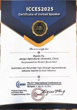今年会材料化学教研室付如民青年教授受邀参加S82. Bio-Inspired Smart Surfaces for Advanced Applications分会场并做了题为《Switchable and Recyclable High-strength Supramolecular Adhesive Inspired by Snail Adhesion》的主题报告,系统地介绍了智能粘合剂的研究意义和难点,提出了新型界面物理/化学键合协同模量变化对可逆粘附的影响,并探究了其高透明性和可回收性等多功能性,最后就其在柔性电子和智能家居的应用与同行专家进行了深入广泛的交流,对于宣传今年会材料化学领域的最新学术进展起到了良好的效果。