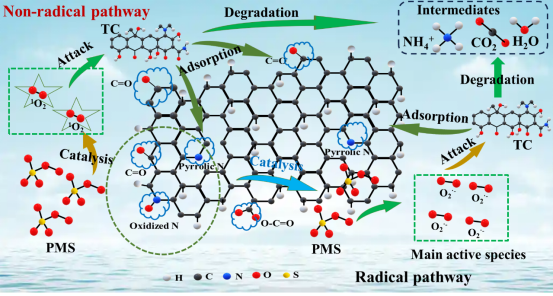 制造高催化活性、经济高效且环保的碳基材料用于水净化仍然面临巨大挑战。由此,在本研究中,以钴铝层状双金属氢氧化物为模板导向材料,以枳壳残渣为生物质原料构筑了具有丰富表面官能团的生物质炭纳米片催化剂(FABN)。随后,以四环素作为抗生素模型污染物,探究了FABN光促活化PMS降解四环素探针污染物的性能。结果显示,在最佳条件下,目标FABN催化剂展现出较高的催化降解效率(0.67195 min-1)。机理研究表明,FABN/PMS体系降解四环素探针污染物主要遵循自由基和非自由基协同降解路径,且降解过程中FABN 催化剂表面丰富的sp2/sp3 杂化碳、石墨 N、氧化 N和含氧官能团 (C=O 和 O-C=O) 等都对PMS的活化起到关键作用。此外,FABN/PMS 系统对其余抗生素污染物(如土霉素、盐酸金霉素、环丙沙星和盐酸米诺环素等)也具有较好的催化降解效果,并在腐植酸、无机阴离子、pH 值和各种实际天然水样等介质内表现较高催化稳定性,表明FABN催化剂具有较高的环境适应性和应用潜力。最后,通过自由基捕获实验、光电化学表征及液质联用分析推测出来FABN光促活化PMS降解四环素探针污染物的降解路径和降解机理。采用小麦种子毒理性分析和 ECOSAR 预测模型证明四环素探针污染物降解中间产物总体毒性降低。本研究为生物质炭纳米片的调控设计和光促活化PMS降解抗生素的作用机制提供了重要理论依据。