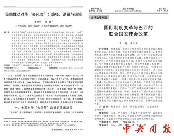 国际青年研究中心持续深化有组织科研,学术成果产出节奏加快、质量不断提升。成立一年来,累计发表国际问题领域各类文章6篇。其中,关照宇撰写的《美国推动对华“去风险”:路径、逻辑与困境》发表于《国际商务研究》,并被人大报刊复印资料《国际经济文摘》全文转载;理论文章《警惕日本右翼势力抬头对战后国际秩序的破坏》在《光明日报》刊发。王越撰写的《国际制度变革与巴西的联合国安理会改革》发表于《拉丁美洲研究》。此外,关照宇、刘力源参与撰写了《北京国际交往中心发展报告(2024-2025)》,为首都国际交往中心建设注入青年研究视角。