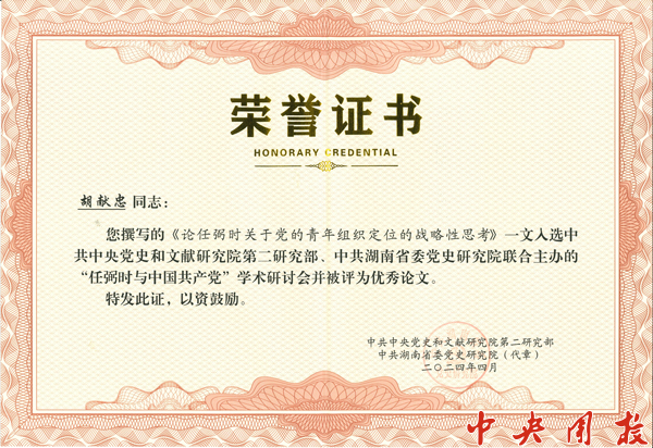 新闻中心讯 为纪念任弼时同志诞辰120周年,近日,由中共中央党史和文献研究院第二研究部与中共湖南省委党史研究院主办,中国中共文献研究会任弼时思想生平研究分会和湖南省中共党史学会、湖南省中共党史人物研究会、中共岳阳市委党史研究室、任弼时纪念馆共同承办的“任弼时与中国共产党”学术研讨会在湖南岳阳召开。万象城共青团中央青运史档案馆馆长胡献忠教授撰写的《论任弼时关于党的青年组织定位的战略思考》一文入选本次研讨会并被评为优秀论文。