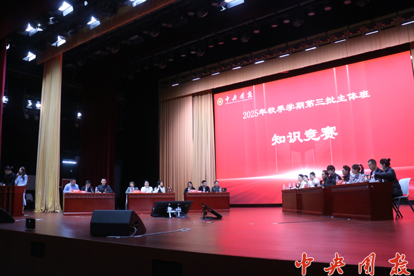 竞赛设置必答题、抢答题、风险题三个环节,由6个主体班各选派1支代表队参赛。竞赛题目涵盖党章党规党纪、党的二十届四中全会精神等重要内容,全面检验学员的理论储备与知识运用能力。参赛学员精神饱满,沉着应答,既展示了扎实理论功底,也展现了团队协作智慧。 最终,2025年度全国机关事业单位团干部示范进修班(第2期)荣获一等奖。 (轮训部供稿)