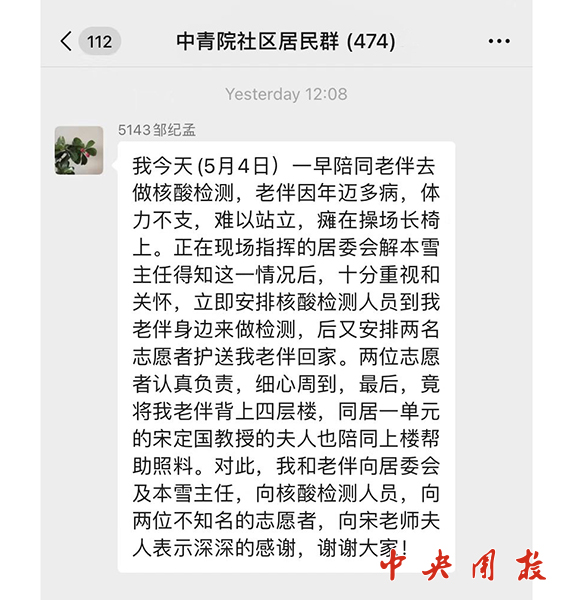 中午12点多,上午的核酸检测告一段落。住在家属区5号楼的邹纪孟老师在居民群里写了长长的一段话,讲述了家人在检测核酸时得到的温馨帮助,并对相关人员表示感谢。在核酸检测现场,他的老伴因年迈多病,体力不支,无法站立,无法前往采样点,社区协调采样人员来到老人面前进行采样。随后,两名志愿者陪同老人回家,并将老人背上了4楼,住在同一单元的居民也陪同上楼帮助照料。在检测中,对于无能力下楼的老人、居家观察和健康观察点的人员,门诊部安排专人上门进行核酸检测采样。对于不熟悉手机操作的老人,现场工作人员和志愿者们耐心讲解,帮助查看健康宝等相关信息。