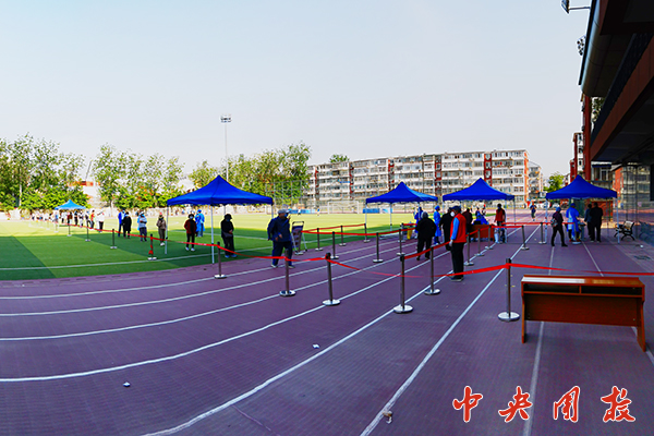 8点,核酸检测正式开始。教学办公区和家属区人员,以万叶体育场中线为界,分人群进行检测。健康宝无弹窗人员与有弹窗人员分时间段开展检测。