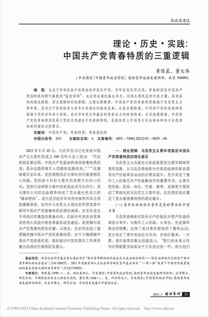 我系教师黄陈晨、董大伟在《理论导刊》2023年第2期发表学术文章《理论·历史·实践:中国共产党青春特质的三重逻辑》。该文认为,立志于中华民族千秋伟业的中国共产党,百年恰是风华正茂。青春特质是中国共产党始终保持朝气蓬勃的“基因密码”,也是党永葆旺盛生命力、实现长期执政的内在力量,具有深刻的理论逻辑、历史逻辑和实践逻辑。从理论逻辑看,中国共产党的青春特质根植于马克思主义青年观,是对无产阶级政党与青年关系理论的继承发展。从历史逻辑看,中国共产党的青春特质熔铸于党的百年奋斗历程,是对百年党史所蕴含的青春动力的延续传承。从实践逻辑看,中国共产党的青春特质发展于党的自我建设中的革新特性,是新征程上开创伟大社会革命和伟大自我革命新局面的必然要求。